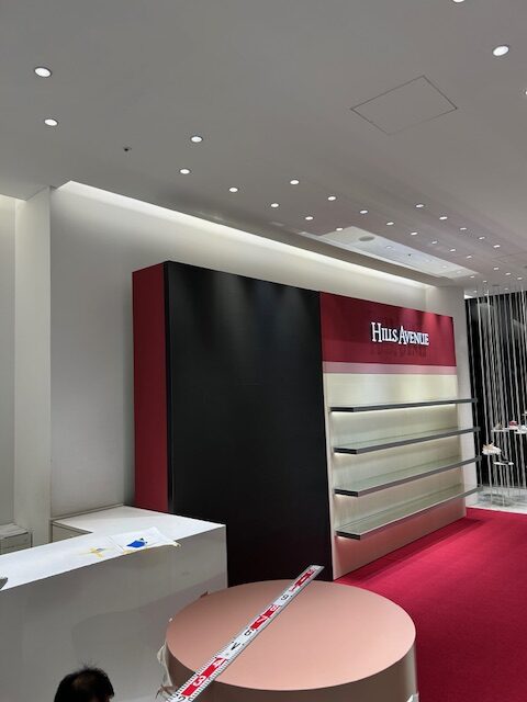 ヒルズアヴェニュー銀座店にて、壁面什器塗装・絨毯貼り替え・置台シート貼りを行ないました。